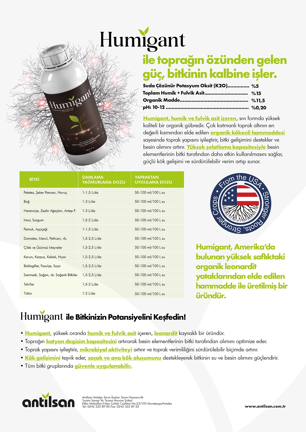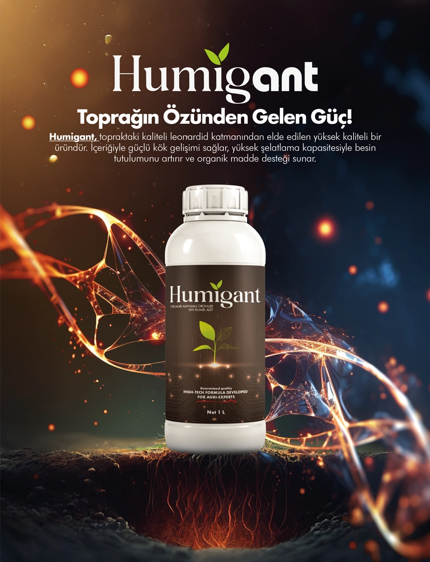 Humigant, topraktaki kaliteli leonardid katmanından elde edilen yüksek kaliteli bir üründür. İçeriğiyle güçlü kök gelişimi sağlar, yüksek şelatlama kapasitesiyle besin tutulumunu artırır ve organik madde desteği sunar.